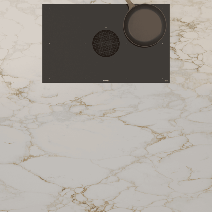 Elevate your space with the opulent look of Arabescato Gold. This Simply HD Digital Quartz features a magnificent, realistic printed pattern with dramatic gold veining, offering a high-status aesthetic that is consistently beautiful across your kitchen.